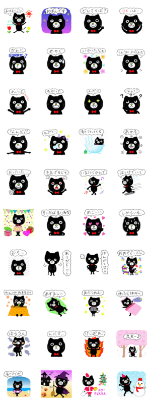 津軽弁のゆるかわ黒猫スタンプ。赤い蝶ネクタイが自慢。津軽弁で楽しく気持ちを伝えよう!