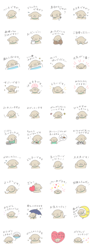 いたわってくれるいぬのスタンプです。上司や先輩にも使いやすい敬語バージョン。疲れたあのひとに送ってあげましょう。sena より発売