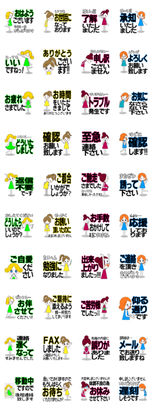 老眼や、高齢者(シニア)の上司へ送るのに見やすい『デカ文字』『ビジネス用』。上司への連絡に使えるものが多めです。お母さん世代が仕事用としても使いやすいのでおすすめ