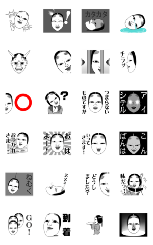 能楽イラストLINEスタンプ第5弾は初のアニメーションスタンプ♪ 日本の伝統芸能「能」を代表するビジュアルである能面を活かしたカワイイデザインをご用意いたしました。kyoran より発売