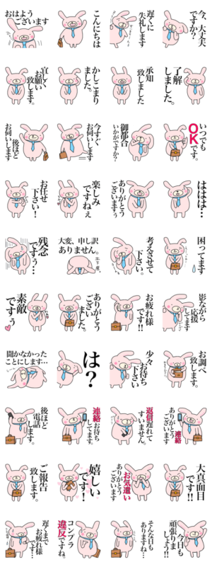 太っちょ営業マンのうさまる。生保など外回りの営業のサラリーマンがお客様向けに使いやすい。新社会人、会社員、保険募集人、その他営業のお仕事の方の為の敬語スタンプ
