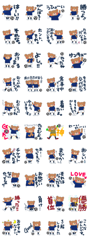 日本代表の選手に憧れるサッカー好きのくまのスタンプ2018Ver.。青いユニフォームのサッカーチームの応援にオススメです。