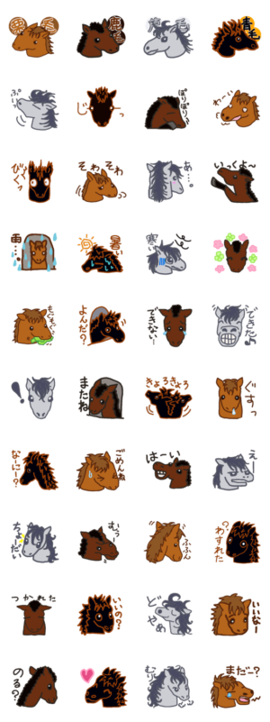 栗毛、鹿毛、芦毛、青毛、かわいい馬達のほのぼの日常スタンプ。乗馬、競馬、牧場、午年、馬が好き!そんな家族、友達、仲間、恋人との会話に。今日も楽しくうまライフ♪SARAH より発売