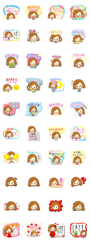 ボブヘアー女子バージョン。目上の人やビジネスにも使いやすいお疲れさま、承知しましたなど基本編にお正月用の新年のあいさつや誕生日も入っています。マスキングテープ風