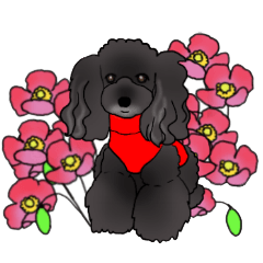 ブラックトイプーのくぅちゃんのスタンプ第4弾です! 今回は英語版です! おしゃれなくぅちゃんと、ゴージャスな花々のスタンプです。海外にはばたけ、くぅちゃん(^O^)