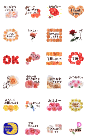 実写の薔薇の花に毎日使うあいさつやよく使う言葉が入った大人かわいいスタンプ。敬語も入って、先輩上司にも使いやすい。大人女子、花(バラの花)好きな人におすすめ。