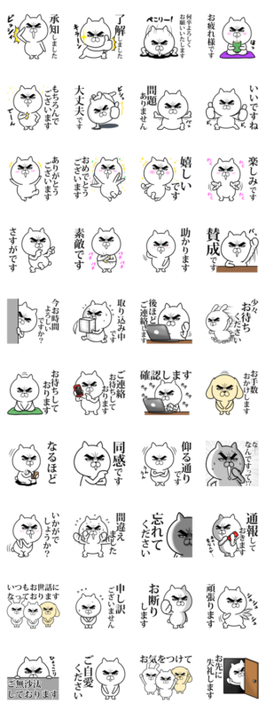 目ヂカラにゃんこ(目力にゃんこ)の敬語のスタンプです。仕事、プライベートで毎日使える内容です。目ヂカラ☆わんこ&うさぎも友情出演!