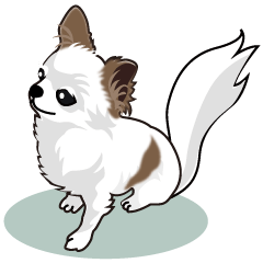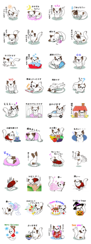 白くてふわふわ長いしっぽのチワワさん。うるうる大きな瞳で癒してくれる日常生活に使えるスタンプです。