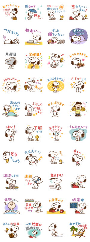 頑張って働いているすべての人へ捧げるスタンプ!お仕事をテーマにしたフレーズが盛りだくさんのパッケージです♪テレビ東京コミュニケーションズ/SNOOPY より発売