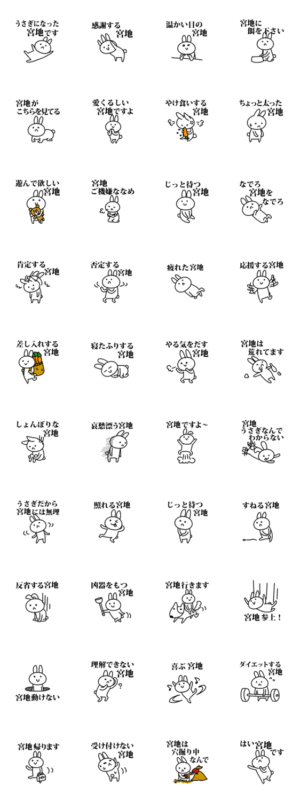 うさぎになりました。その最高に愛くるしいかわいい仕草で、日常的に使えるスタンプです。苗字が入った名前スタンプなので毎日使えるんです。ぴょん