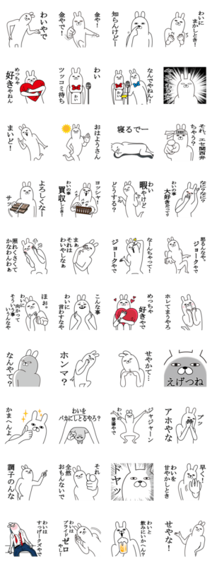 ウサギの方言スタンプ関西弁編。大阪弁、兵庫県の神戸弁、奈良弁、和歌山弁、京都弁、滋賀弁を集めたよ。友達や家族や彼氏や彼女や恋人同士誰でも使えるやさしいスタンプ