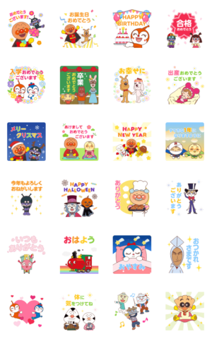 誕生日、クリスマス、お正月などのイベントやお祝いはもちろん、日常のあいさつやお礼に使えるスタンプがそろっているよ!アンパンマンやなかまたちと気持ちを伝えよう♪
