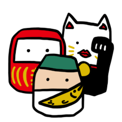 漫画家・石田意志雄による石形スタンプです。金の鮎菓子を抱える意志雄、だるま、招き猫、五月人形、雛人形、歌舞伎、忍者などのかわいいキャラクターが大集合!