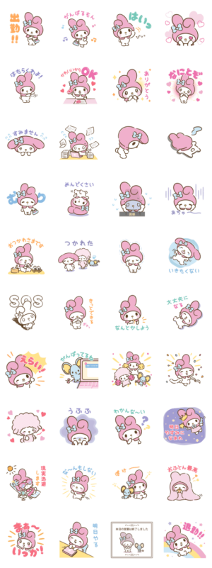 マイメロディのおしごとスタンプが登場!がんばるあなたの素直な気持ちをマイメロディが伝えるよ!「はたらく」ってよくわかんないけど、今日もおしごとがんばるもん♪