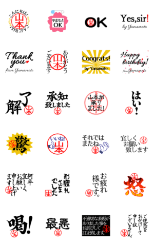 時には真面目に時には力強く、時にはオシャレに時にはかわいく。はんこメインのデカ文字山本さんスタンプです。