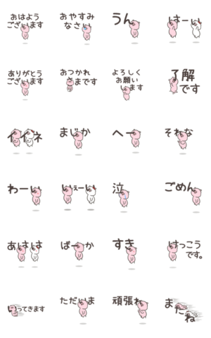 “たぶんブタ”シリーズの番外編的に作ったぶたのスタンプ。 使いやすい言葉で文字も大きめ且つシンプルでちょっとウザイ。鼻が引っかかって可哀想だけどなんか癖になる…