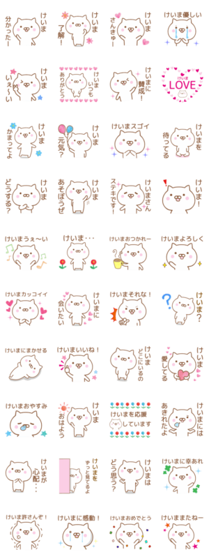 友人・恋人・家族の【けいま】さんへ送れる、ネコの名前スタンプです。けいま/ケイマ/桂馬/けい馬/繋馬/啓馬/恵万/keima