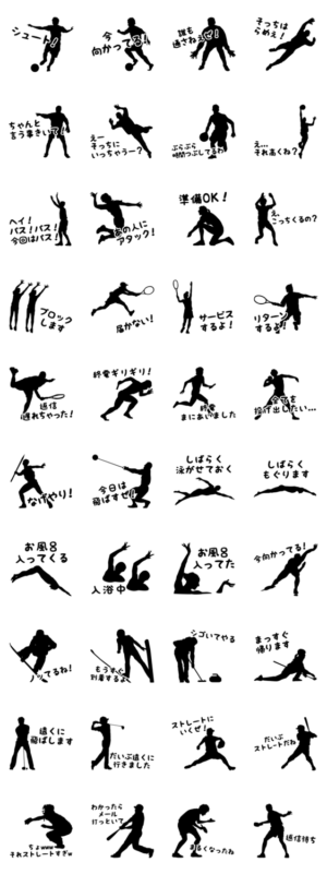影と一言でクスッと笑えるスタンプ サッカー,野球,バスケ,カーリング,バレー,テニス,水泳,スキー,スノボやマラソンなどの競技でダジャレで連絡したいなど使い方はフリー!