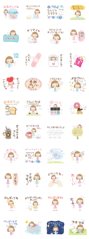 前髪が短めな女の子がたくさんの言葉をこれるスタンプです。うれしいですね!