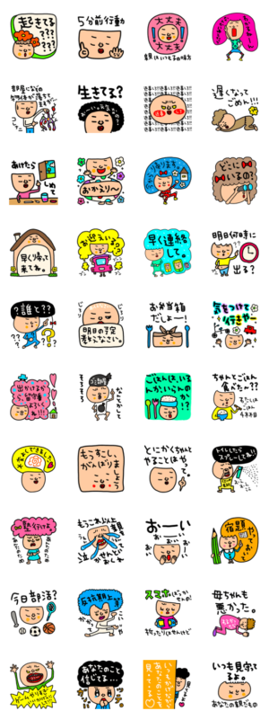 親から子供へ送るセット。皆様からセリフ募集しましたスタンプ。かわいいものからシュールなものまで。riekim より発売
