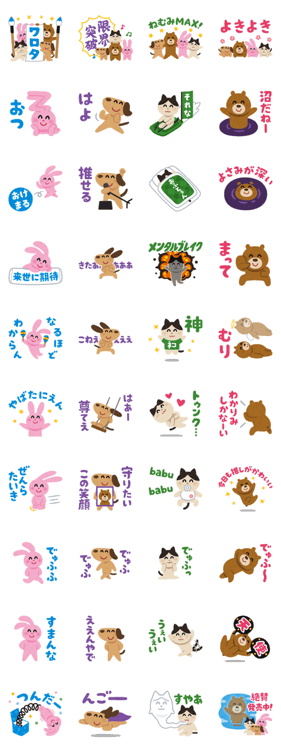 いらすとやのウサギとイヌとネコとクマのキャラクターが笑顔で遊んでいるスタンプです。