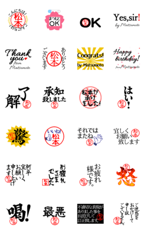 時には真面目に時には力強く、時にはオシャレに時にはかわいく。はんこメインのデカ文字松本さんスタンプです