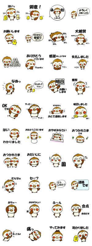 吹き出し、敬語、お礼、返事、ツッコミなど、普段使いの使いやすいひとことスタンプです。チュンチュンワールド全開だよ!
