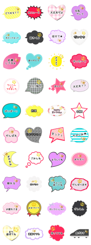 日常会話で使える吹き出し型のシンプルなふせん風スタンプです。クラウンだけでなく、ニーズに合わせてハートやジャックなど他の形も◎