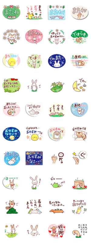 「おやすみ」「またね」など会話をいったん終わりにしたり、しめくくりたい時などに、便利な言葉のセットスタンプです。