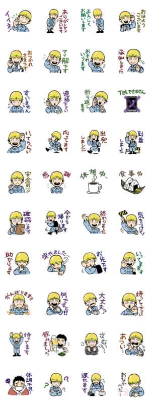 工事仕事している人向けスタンプ。お兄さんでもおじさんでもどちらでも良いです。作業している方、現場の方、敬語ですので幅広く使えます。