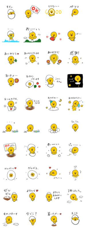 ひよこ、ぴぴまるの毎日スタンプ。よく使われる言葉から敬語までが入った基本セットです。ELF より発売
