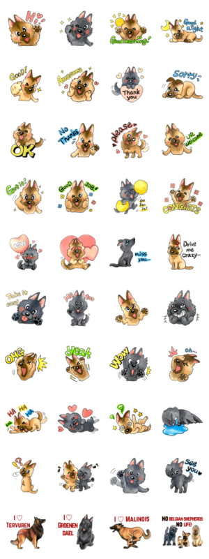 表情豊かなタービュレン、グローネンダール、マリノアが登場!ベルジアンシェパードを愛している方はもちろん、知っている方も知らない方も使いやすい英語版のスタンプ。
