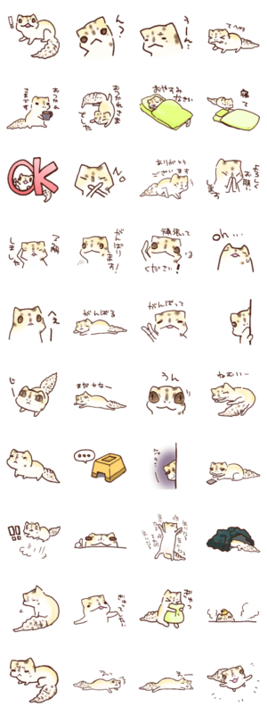 ぷりぷりなしっぽがかわいい爬虫類、ヒョウモントカゲモドキ(レオパードゲッコー)のデフォルメスタンプです。モデルはレッドストライプ ホワイト&イエローの女の子。anjelier より発売