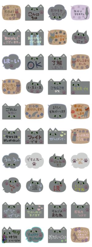ロシアンブルーからメッセージ。北欧風で大人可愛いクラフト紙のような風合いに猫のシルエットの吹き出しなど日常やお仕事でつかえるデカ文字の敬語スタンプ。誕生日/七夕ひまわり組。 より発売