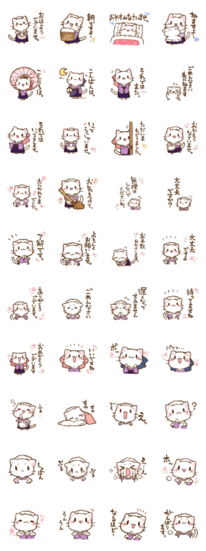 少し控えめな和風にゃんこスタンプです。 控え目なので仕事相手にも使いやすく、尚且つ友人や家族への返信にも使いやすいおすすめなスタンプになってます!りくお より発売