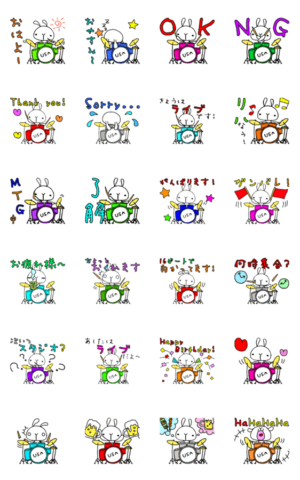 バンドマン、ドラマーさんが使いやすい日常スタンプです。 無表情なうさぎがドラムを叩きます! 動くスタンプもあります。三月うさぎ つぅ より発売