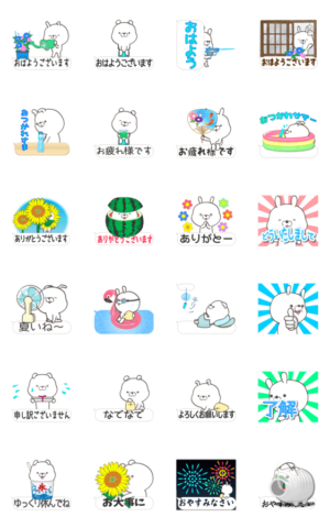涼しい色合いの夏用の動く日常会話で、よく使う、おはよう、お疲れ様、ありがとう、おやすみが多めで、その他、どういたしまして、了解、よろしく、なでなで、お大事になどHummer より発売