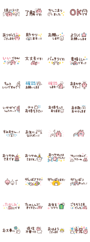 縦幅スリムでトーク画面を圧迫しない、省スペースのスタンプです。誰にでも使いやすい敬語基本セット!ちょこんと添えられたピスケ&うさぎで、硬すぎない印象に。