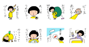 おかっぱ頭と黄色いワンピースがチャームポイント、げんきなおもちちゃんの一生に1回くらいは使えるスタンプです。