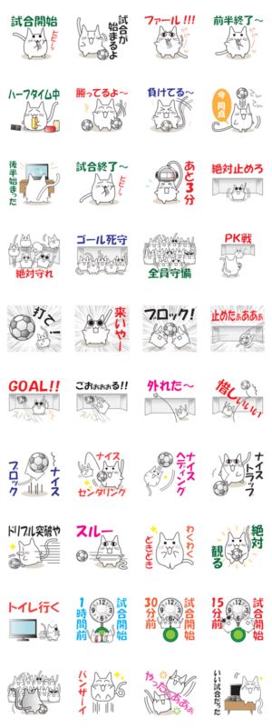 可愛いネコのサッカースタンプ第2弾。文字を見やすく変えました。ワールドカップのお供にどうぞ。パス・シュート・ゴール、色々あるよ。W杯、頑張れ日本代表!まゆぽん より発売