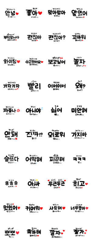 読み方と翻訳つき♪シンプルで見やすい大きな文字の韓国語スタンプです♪お友達とのラインや韓国語の練習にもおすすめです♪ぴよたぬき より発売
