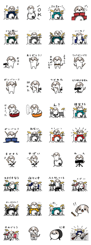 バンド生活でよく使うスタンプをドラム犬バージョンで作りました。犬種モデルはシーズーです。