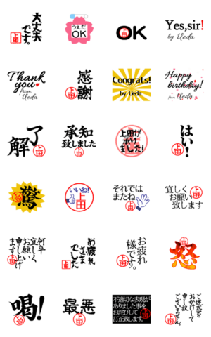 時には真面目に時には力強く、時にはオシャレに時にはかわいく。はんこメインのデカ文字上田さんスタンプです。