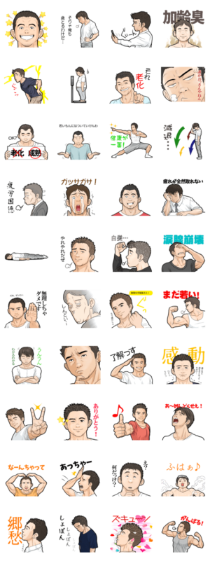 30代40代あたりから気になってくる加齢。 そんな年頃の男性達が使えるようなスタンプです。 加齢(老化)ネタだけでなく普段使いできるものも。ousuke&shinya@mfvillage より発売