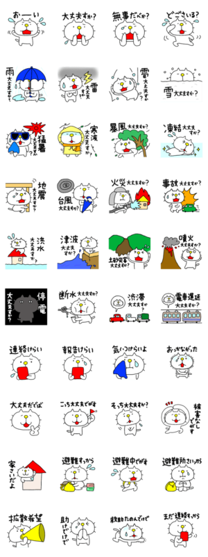 東北訛り(時々気仙沼弁)で、家族や友達へ災害や事故など万が一の事があった時に安否確認のために送るスタンプです。こんなスタンプを送らなくて済む毎日でありますように。