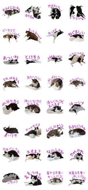 実写指書き猫スタンプです。ハチワレ猫ズが、夏ならではのフレーズを だらだらしながらつぶやきます。暑中見舞い、残暑見舞いもあり。モデルはうちの猫(とらお&ぽう)です。