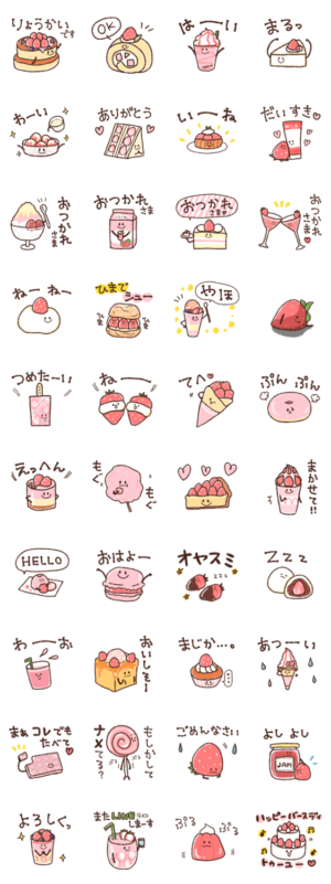 苺好きによる苺好きの為のスタンプ。 ケーキやドーナツ、いちご牛乳…とにかくイチゴだらけ。使いやすいスタンプだけを集めました。
