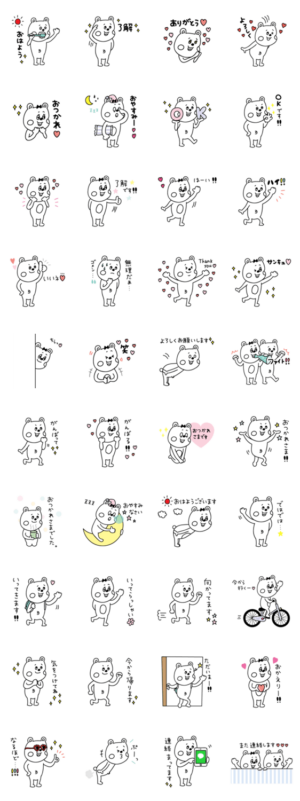 ラクガキ調くまカップル静止画スタンプ3つ目は毎日使える!をテーマに使いやすい言葉を詰め込みました☆シンプルだけど、どこかクセのあるくまカップルです!