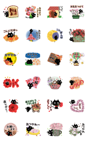 よく使う言葉や毎日使えるあいさつ入りの黒猫(くろねこ)とバラの花【アニメver】基本セット。可愛すぎず大人やさしい、敬語入りで無難な使い易いスタンプ【デコスケ】デコスケ より発売