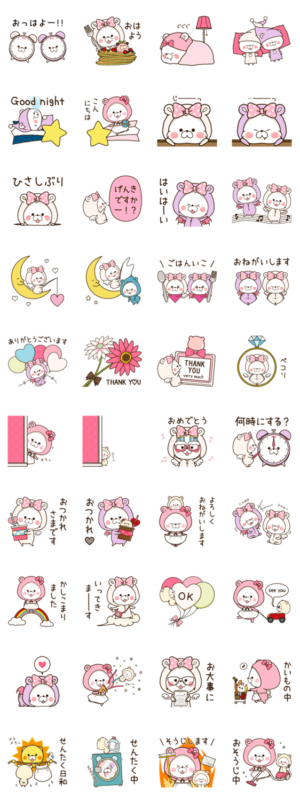 女子力高め!くまのおうちシリーズのガーリーなスタンプです。家事スタンプもあるので、主婦やママさんにもオススメ♡登場キャラ:サクラ/ちびぽこ/リボン/アクマ